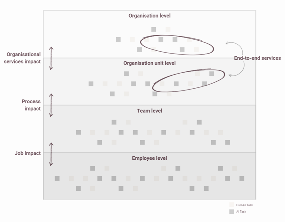 The impact of AI is not confined to the job role level, but can have a direct and indirect impact on the team, end-to-end services, and entire business unit levels. If AI affects one layer, the impact can cascade to others. This means that analysing work only at the role level will always miss the bigger picture.