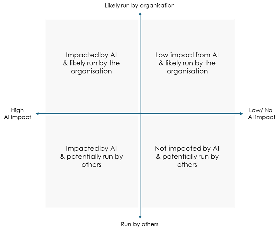 A useful exercise is to map all tasks, roles, and end-to-end services in your organisation across two dimensions: first, the extent to which AI can perform this work, and second, the likelihood that this capability will shift outside your organisation, for example, to new entrants or even to customers themselves.